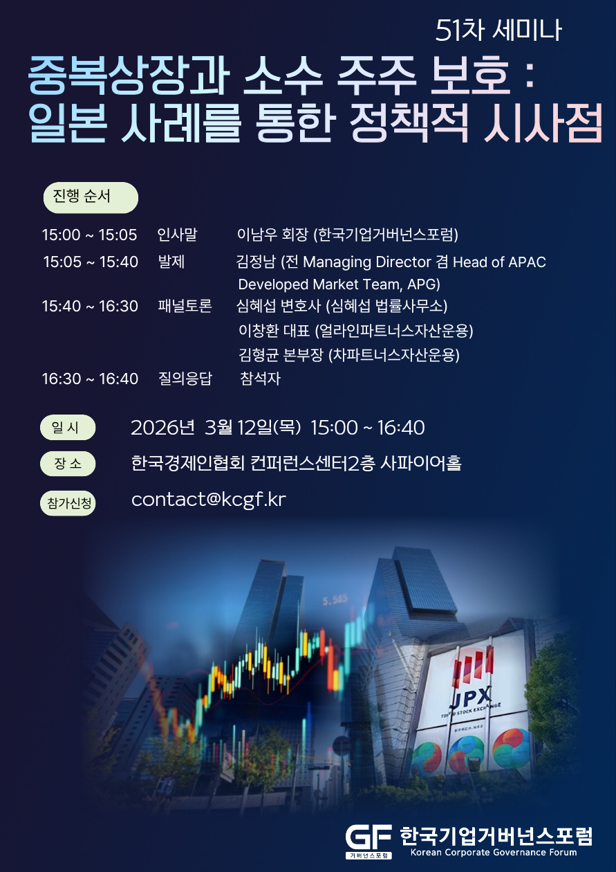 사단법인 한국기업거버넌스포럼은 금융위원회에 등록된 공익법인입니다.